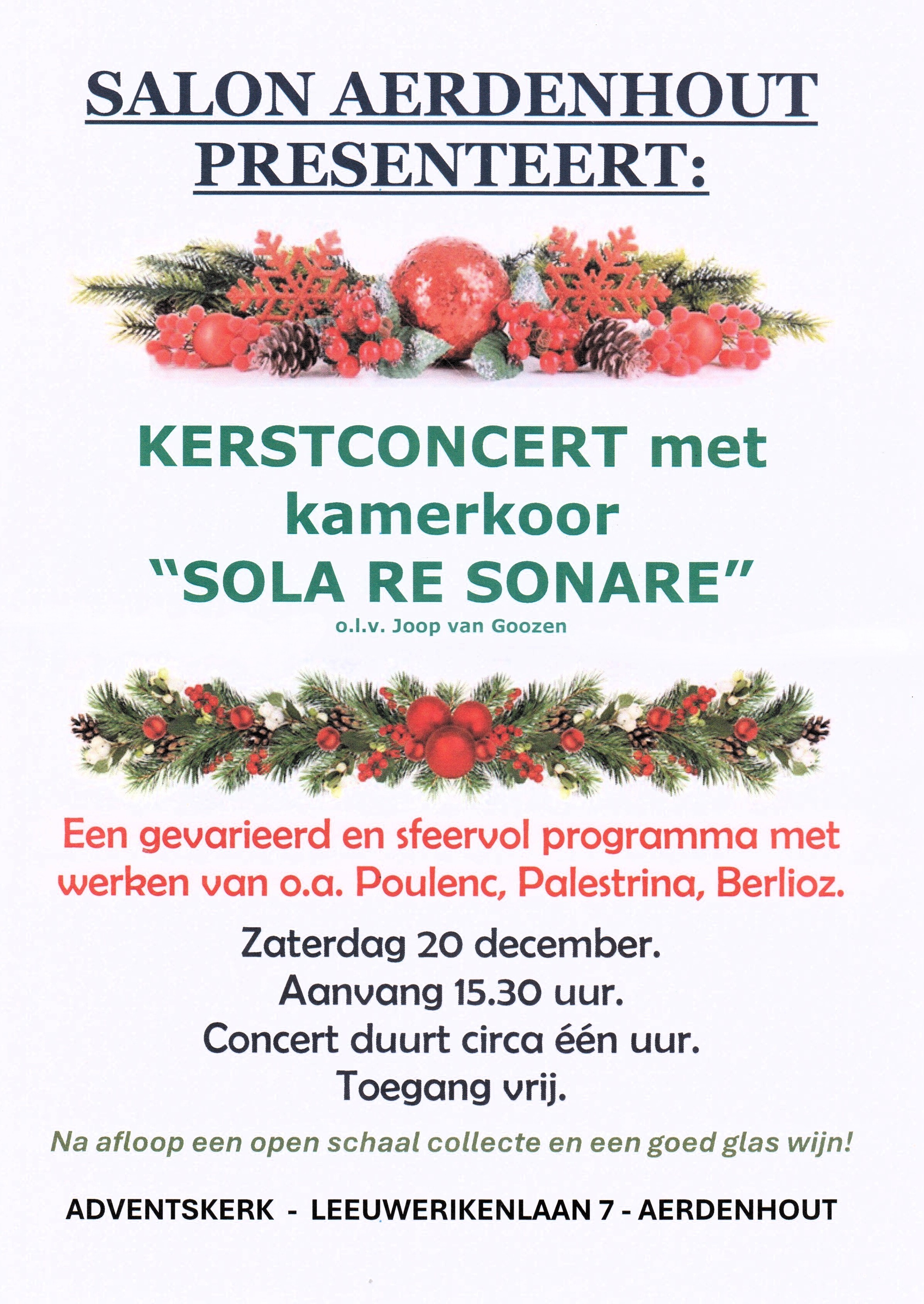 AgendaKerstconcert Salon Aerdenhout 20 december 15.30uGevarieerd Sfeervol Programma met werken van o.a. Poulenc, Palestrina en Berlioz.Gerelateerde eventsAgenda